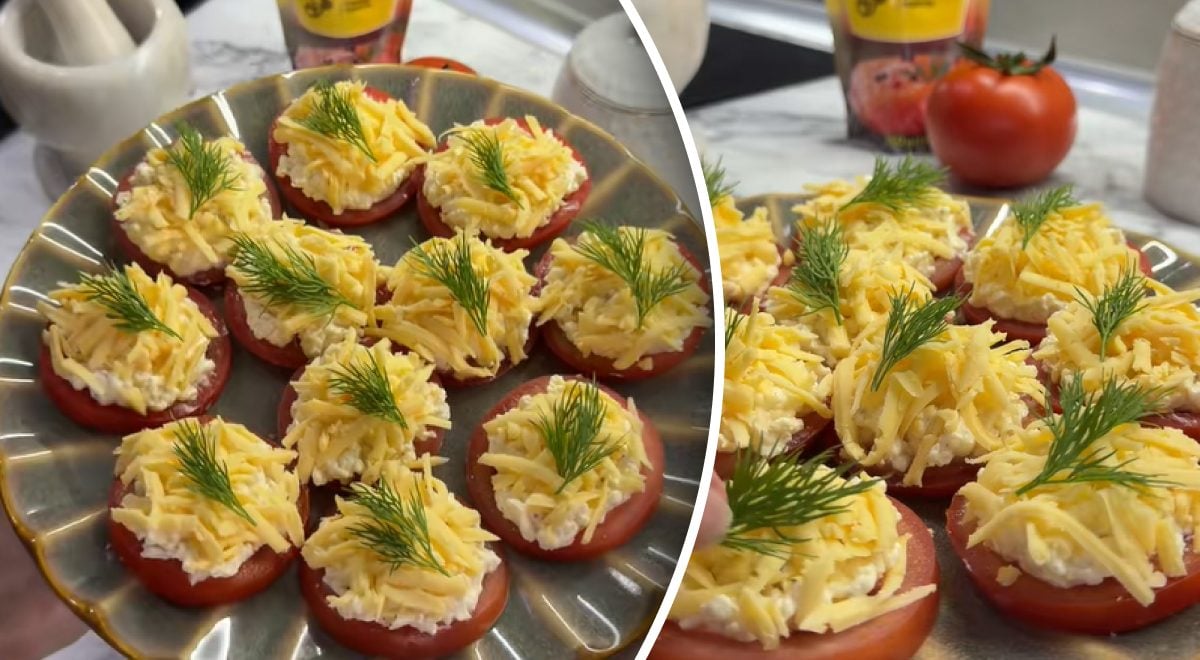 Tomātus sagriež šķēlēs. Sajauc rīvētu kausēto sieru, majonēzi, sasmalcinātu ķiploku, piparus un iecienītākās garšvielas. Uz tomātu šķēlītēm liek pildījumu un pārkaisa ar rīvētu sieru. Dekorējiet uzkodu ar dillēm.