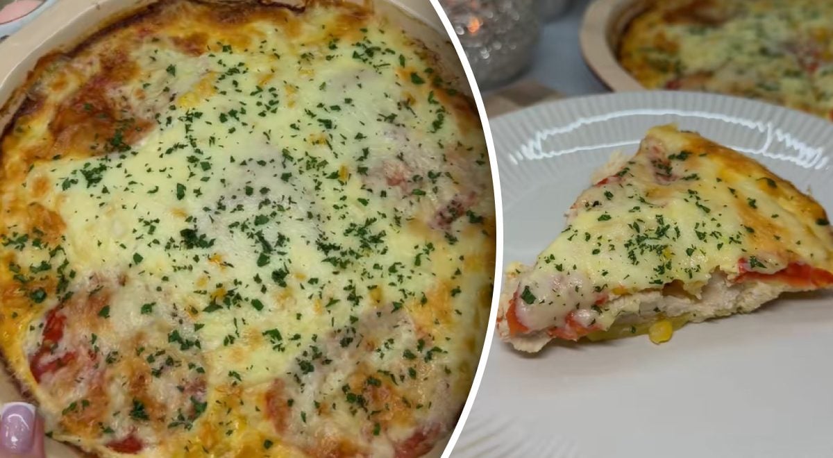 Pēc tam uz pildījuma liekam šķēlēs sagrieztus tomātus un izklājam kukurūzu. Trauku cep cepeškrāsnī, kas uzkarsēta līdz 200 grādiem 20 minūtes. Pēc tam samaziniet temperatūru līdz 180 grādiem un cepiet vakariņas vēl 25 minūtes. 10 minūtes pirms gatavošanas apkaisa trauku ar sieru.